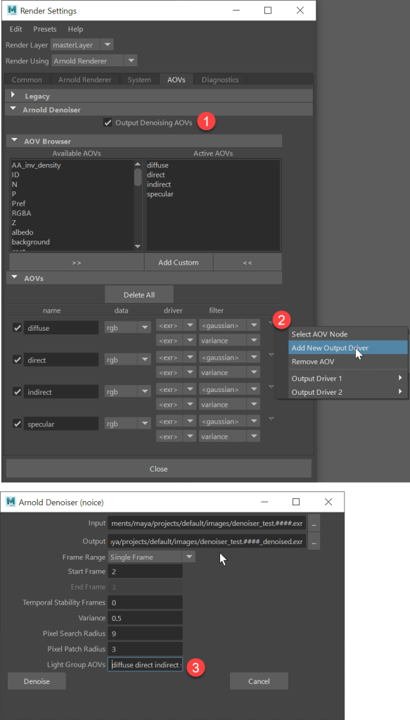 When you denoise the AOVs, you’ll see something like this in the Arnold Denoiser log: