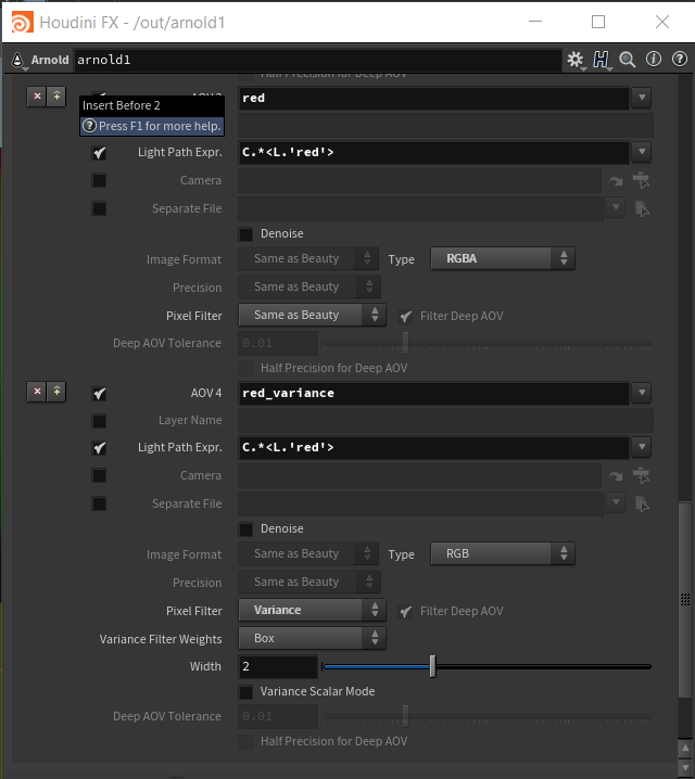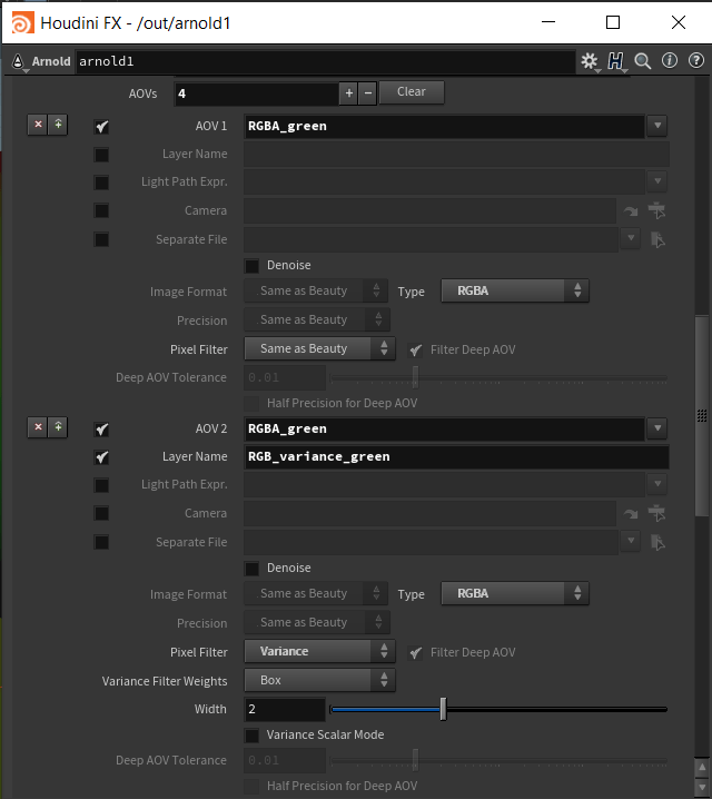 For example, suppose you give both AOVs the name “RGBA_green”. Then give the variance AOV a different layer name, like “RGB_variance_green”