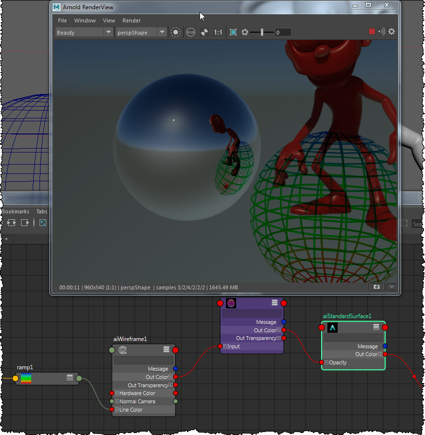 The mesh light color is facing-ratio ramp, so that in the Beauty AOV, the polygons facing the incoming camera ray are red, and polygons facing away are green.